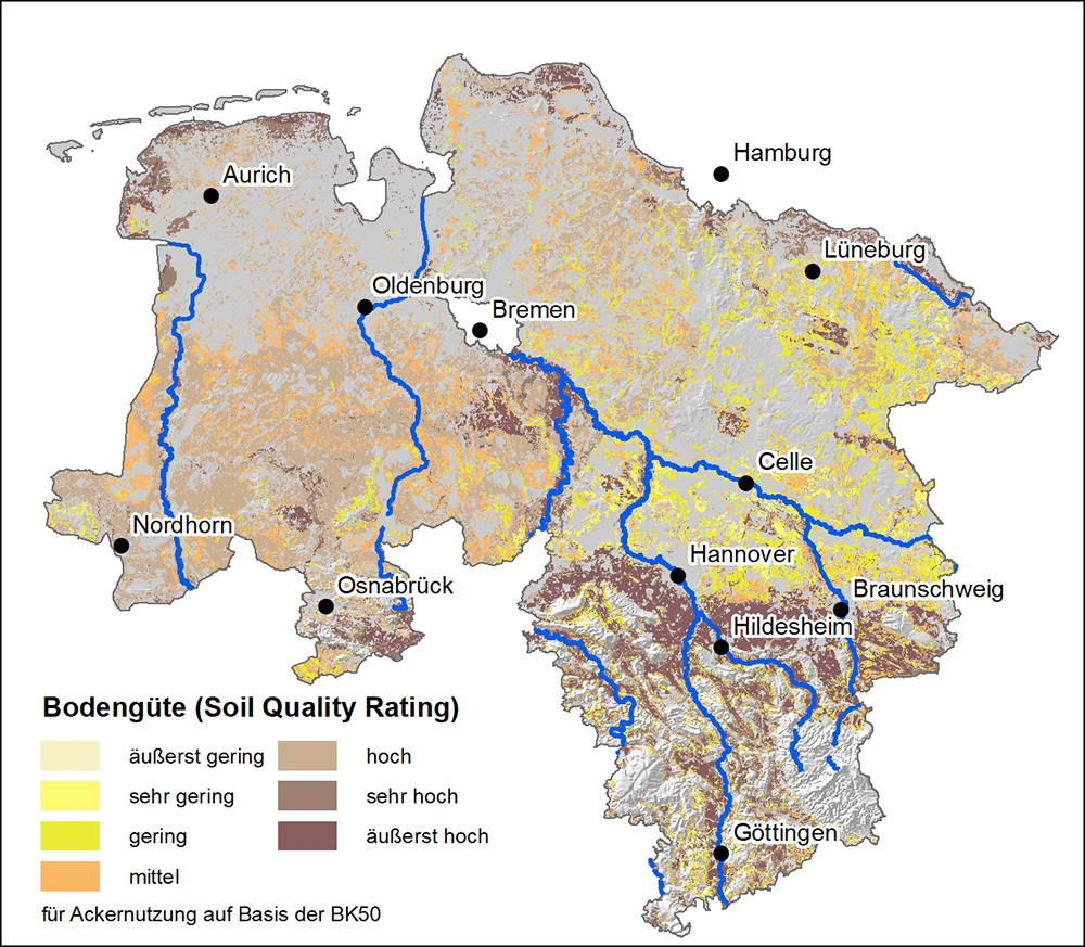 Diese Eigenschaften des Bodens können genutzt werden, um in Auswertungskarten die unterschiedliche Fruchtbarkeit der Böden darzustellen. Von besonders hoher Fruchtbarkeit sind die Böden in der Lössbörde, unter denen sich auch die fruchtbaren Schwarzerden finden. Aber auch innerhalb der Geest gibt es besonders fruchtbare Böden, z. B. in den Sandlössgebieten. Auch entlang der Küste in den Marschen liegen teils äußerst fruchtbare Böden, die ackerbaulich genutzt werden.