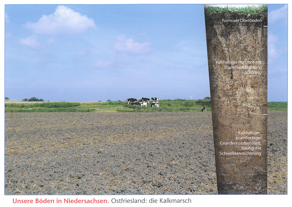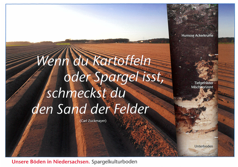 Abhängig von den Bodeneigenschaften finden sich in Niedersachsen typische Landschaftseindrücke, die auch mit der ackerbaulichen Nutzung zusammenhängen. So kann manchmal schon von den angebauten Feldfrüchten darauf geschlossen werden, welche Böden eine Landschaft prägen. Die folgenden Bilder zeigen typische Landschaftseindrücke aus Niedersachsen und die zugehörigen Ackerböden.