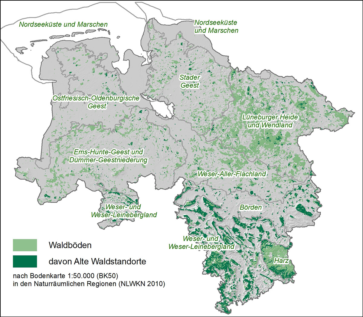 Neben ausgedehnten Flächen in Ostniedersachsen und natürlich dem Harz ist vor allem das niedersächsische Bergland auf den Höhenzügen bewaldet. Die folgende Karte zeigt die Verbreitung der niedersächsischen Waldböden.