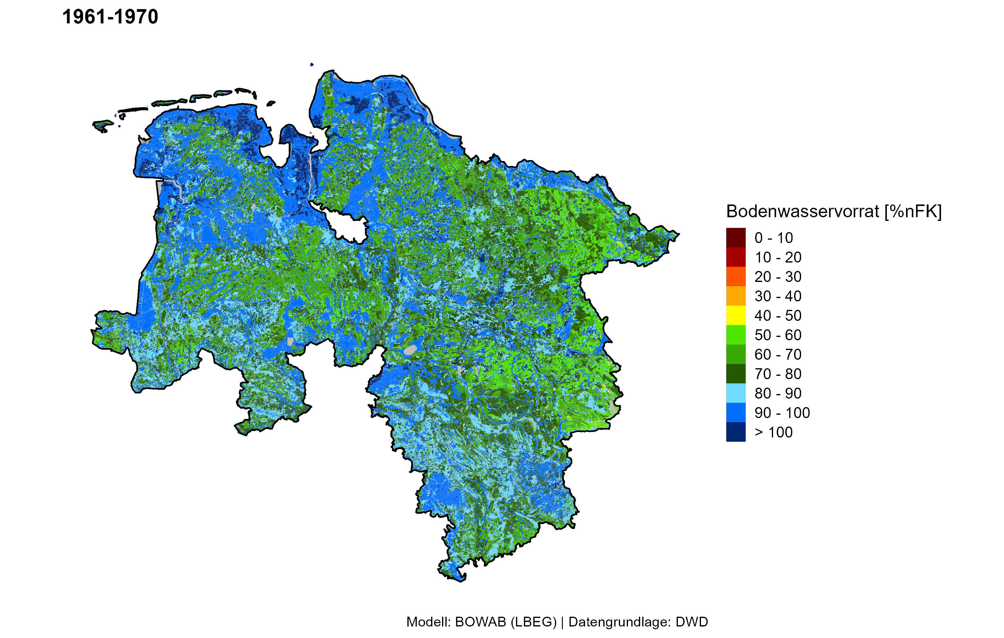 Bei der Beantwortung dieser Frage helfen Auswertungen durch das Bodenwasserhaushaltsmodell BOWAB des LBEG. So haben die Bodenwasservorräte im Zeitraum 1991–2020 im Vergleich zu 1961–1990 in der Vegetationsperiode (April – September) abgenommen. Vor allem die Dekade 2011–2020 war besonders trocken. Karten dazu werden auf dem NIBIS® Kartenserver bereitgestellt. Über den Maptip "> zur Detailseite" können auch weitere Auswertungen wie Grafiken und Tabellen abgerufen werden.