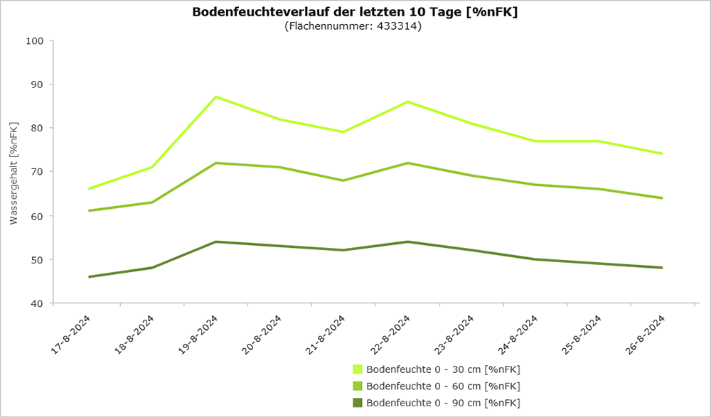 Im Kartenbild des NIBOFID ist die berechnete Bodenfeuchte für den Boden von 0–60 cm Tiefe dargestellt, der dem Hauptwurzelraum bei den meisten Böden und Nutzungsformen entspricht. Standortbezogene Informationen liefert ein Maptip. Durch das Klicken auf einen Standort wird der aktuelle Bodenwassergehalt für den Hauptwurzelraum in %nFK angezeigt. Zusätzlich können auf der Detailseite weiterführende Informationen abgerufen werden. Als Grafik wird der Verlauf der mittleren Bodenfeuchte für die vergangenen 10 Tage für die Tiefenbereiche 0–30 cm (Oberboden), 0–60 cm (Hauptwurzelraum) und, sofern der Boden mächtiger ist, 0–90 cm (gesamte Betrachtungstiefe) dargestellt. Zudem wird die Sickerwassermenge unterhalb von 90 cm Tiefe für den betrachteten Standort angegeben.