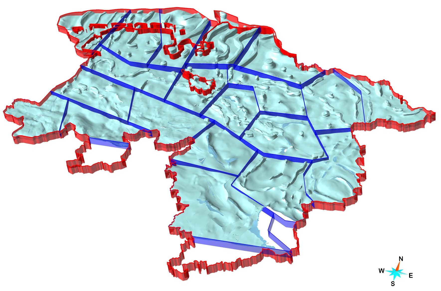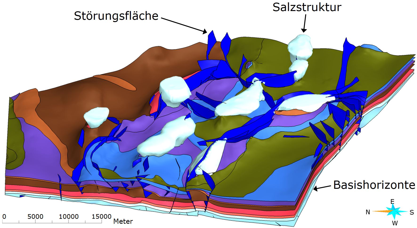 Aufgrund der großen Modellfläche und der hohen Anzahl geologischer Strukturen wurde das Modell TUNB3D-NI in 20 Modellkacheln aufgeteilt, die an den Kachelgrenzen untereinander harmonisiert sind.